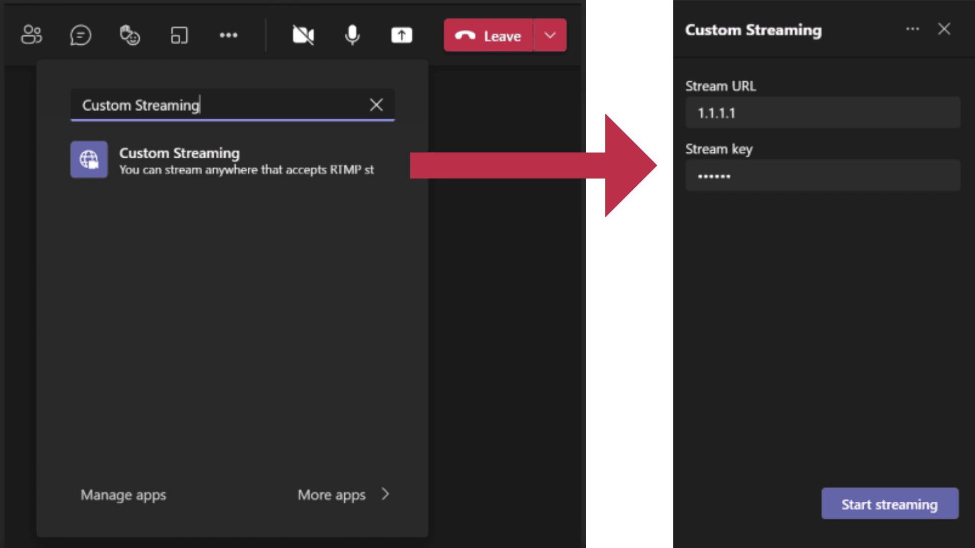 7. In the Custom Streaming Meeting app of Microsoft Teams, copy and paste the Streaming URL and Stream Key from Edit on the Spot to the Input fields.