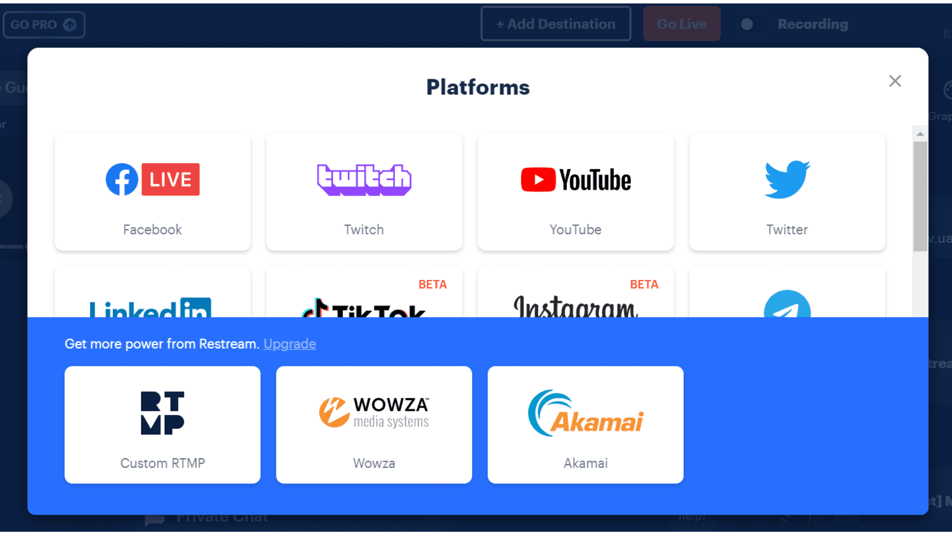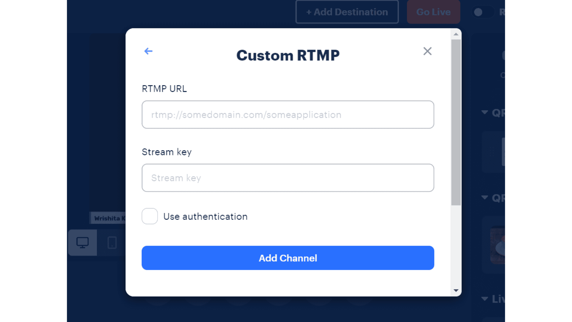 8. Click "Add Destination" and then ‘Custom RTMP’.